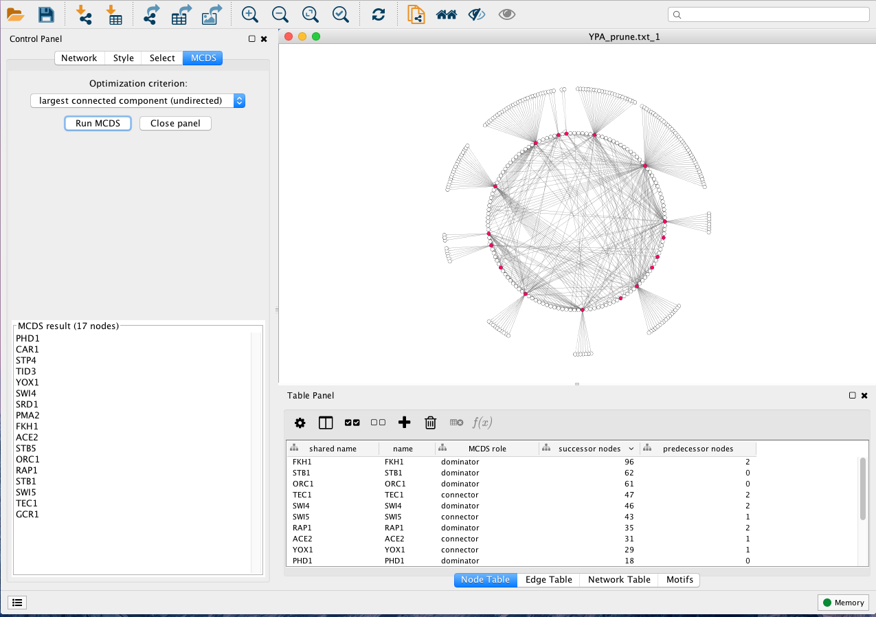 MCDS is a Cytoscape app that allows users to find an approximate MCDS solution in a directed graph. The user can choose to run the algorithm on the largest connected component underlying directed graph (LCCD) and undirected graph (LCC), as well as the strongly connected component (SCC) of the network. The connectivity among the nodes in the MCDS can then be visualized via Cytoscape.